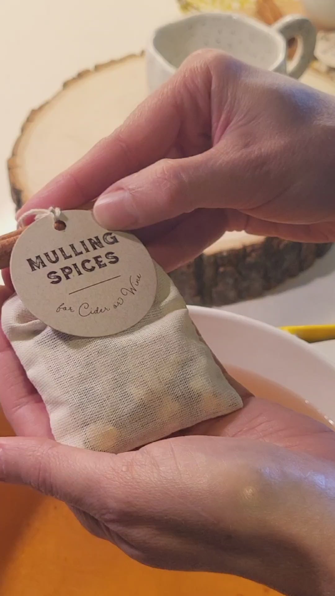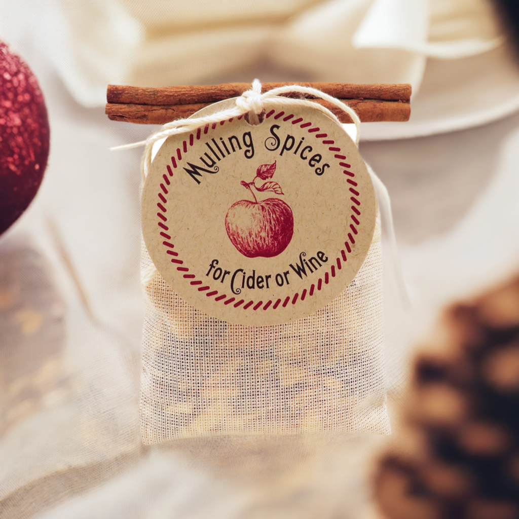 Each sachet is packaged in a 2 3/4" x 4" muslin bag filled with mulling spices to include aromatic cinnamon chips, allspice, orange peel and cloves. A round kraft tag is attached and embellished with a darling cinnamon stick. We didn’t forget instructions either - they’re printed on the back of the tag for brewing.