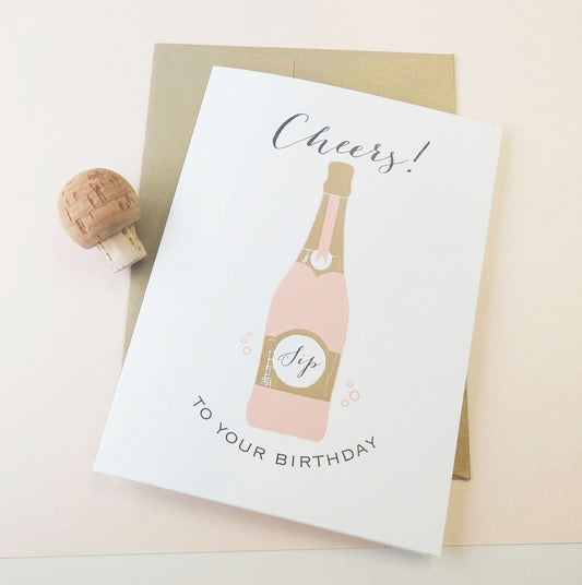 Tarjeta de cumpleaños de saludos de botella de champán rosa