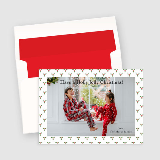 Tarjeta fotográfica navideña con estampado de bayas de acebo