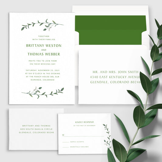 Explora nuestras invitaciones de boda ya confeccionadas. Estas opciones son fáciles de pedir en línea, pero estamos disponibles para cualquier pregunta o ayuda. Te invitamos a visitarnos con cita previa en Denver o a llamar al 303-884-7787.