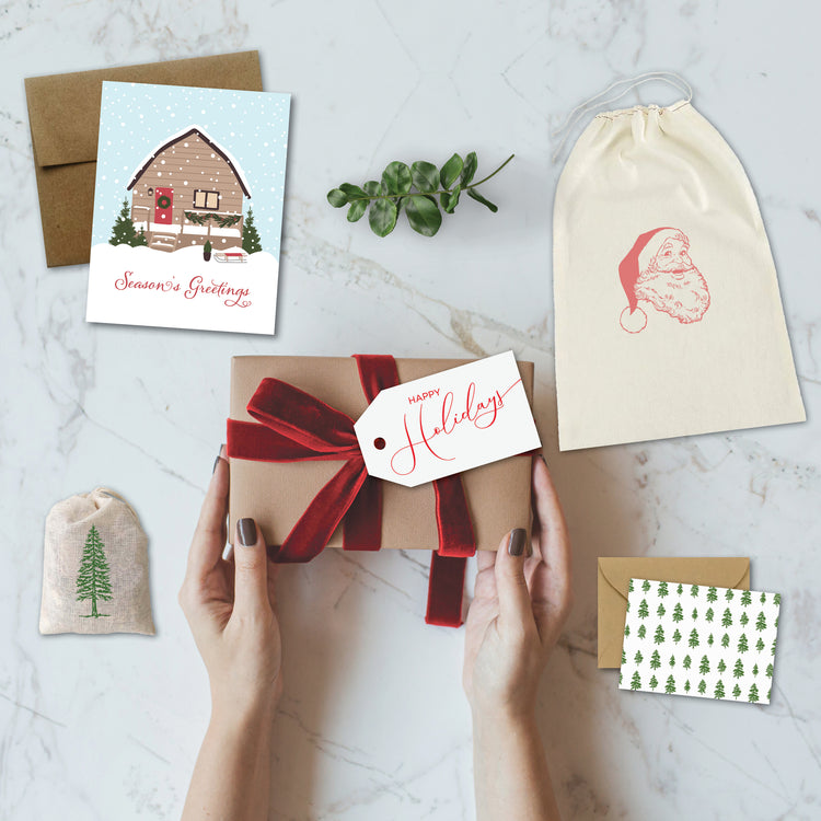 Une collection de packs de cartes de vœux, d'étiquettes cadeaux, de sacs cadeaux et d'une sélection d'idées cadeaux de Noël.
