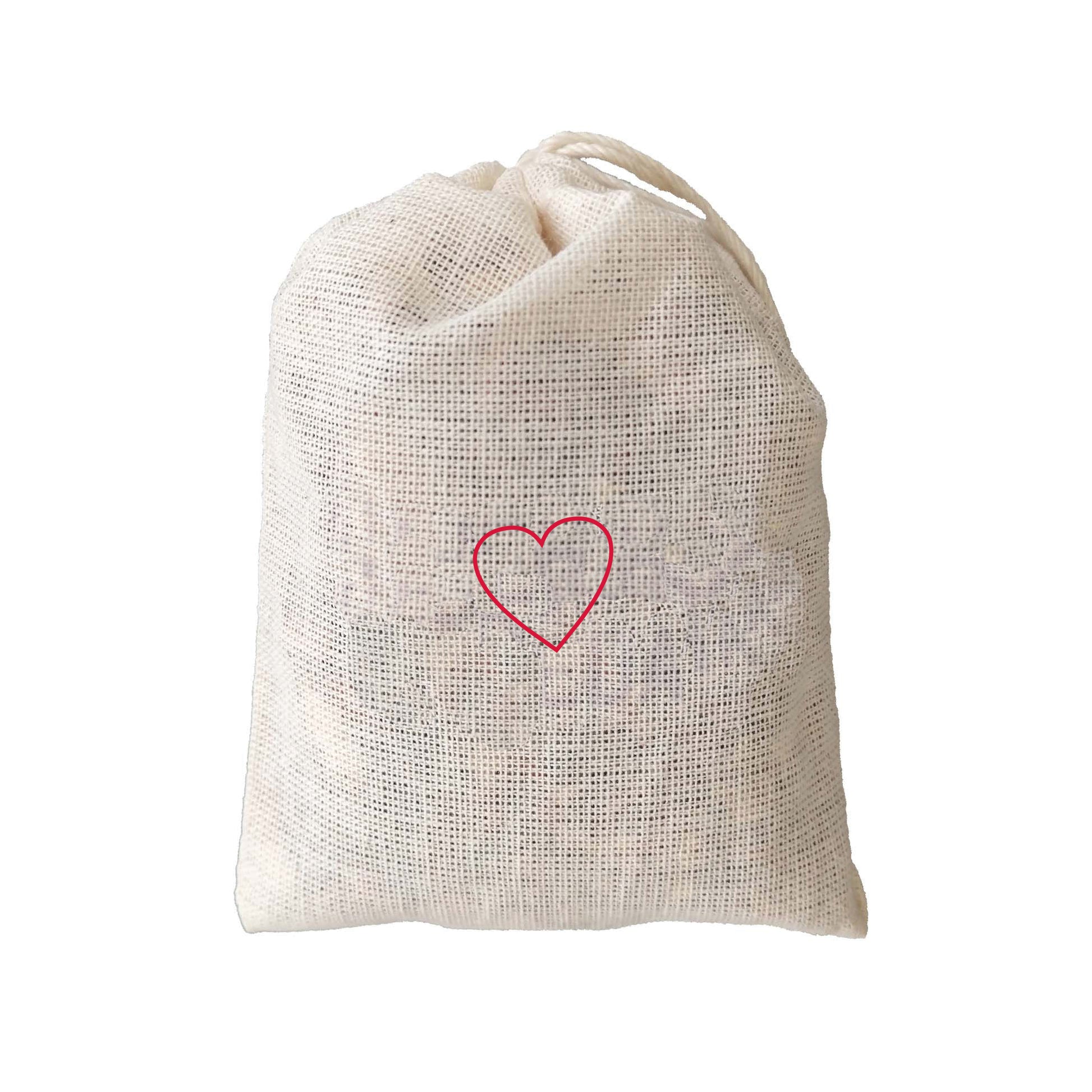 Our lovely muslin bag is printed with a small red heart outline. Each bag is run through our 1930's Chandler and Price letterpress, providing a sophisticated yet one-of-a-kind printing.