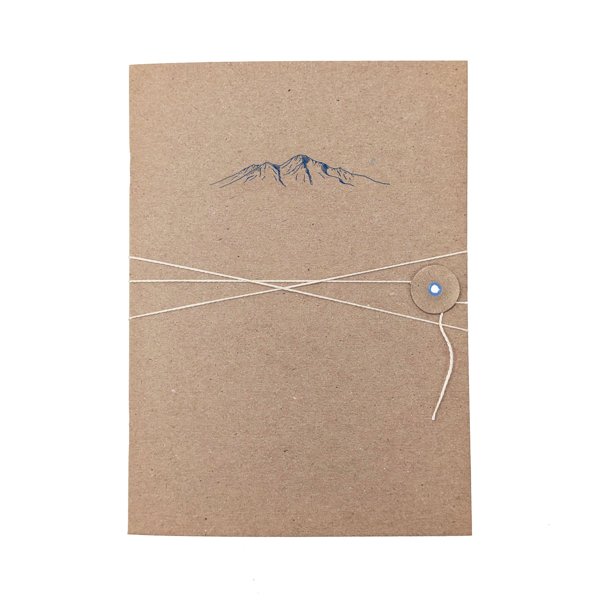 Each handcrafted journal is approximately 5.25" x 7.25" in size. The cover is composed of sturdy recycled chipboard letterpress printed with a mountain range in navy blue ink. Each journal is finished with a handmade chipboard button and string embellishment with light blue grommet. Natural ivory twine is wrapped around the journal and button to secure the journal shut. When opened 26 lined journal pages are found inside for your inspiration and note taking. The journal is finished with staple binding on the spine of the design